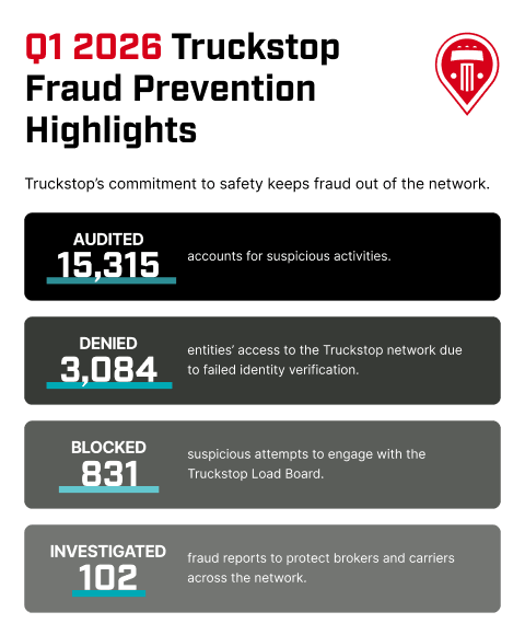 Truckstop’s teams monitor for risk continuously, investigate reported cases, and work to make sure the companies on the load board are who they say they are. The Q1 data reflects that work, and points to where vigilance needs to stay high as 2026 continues.